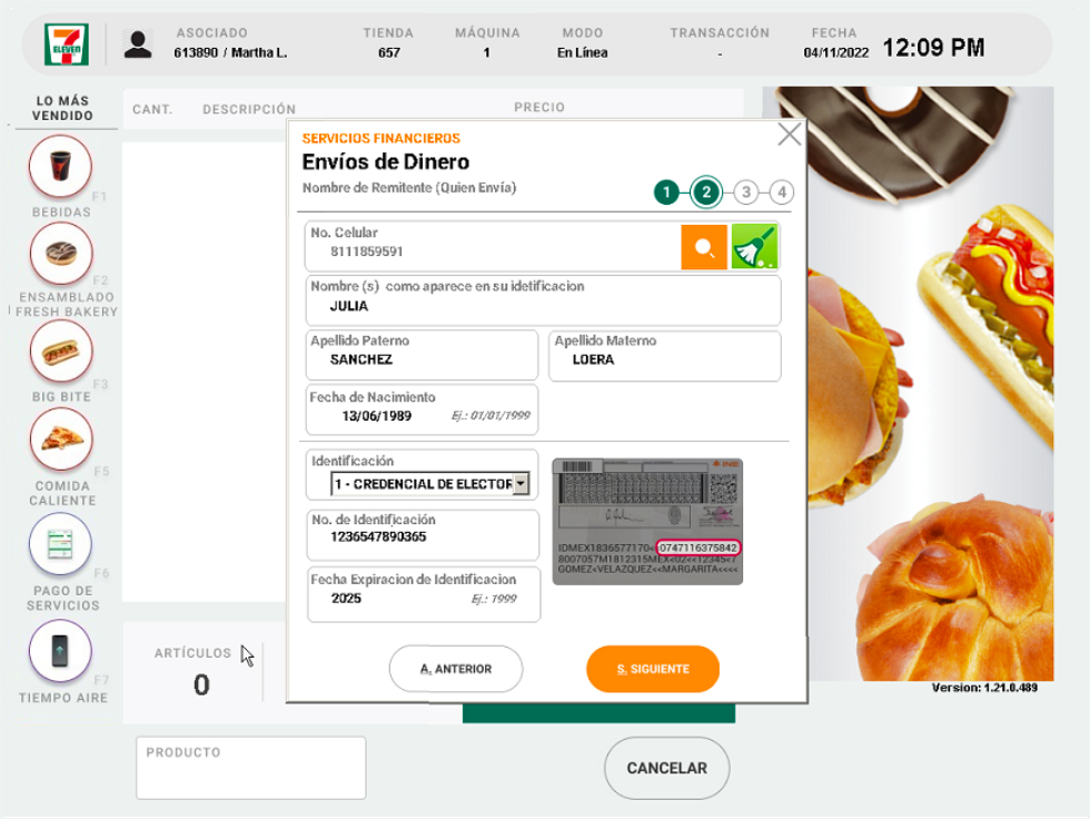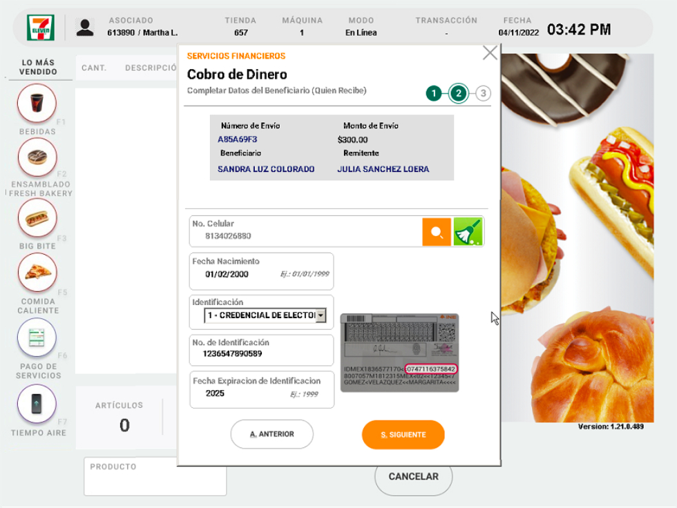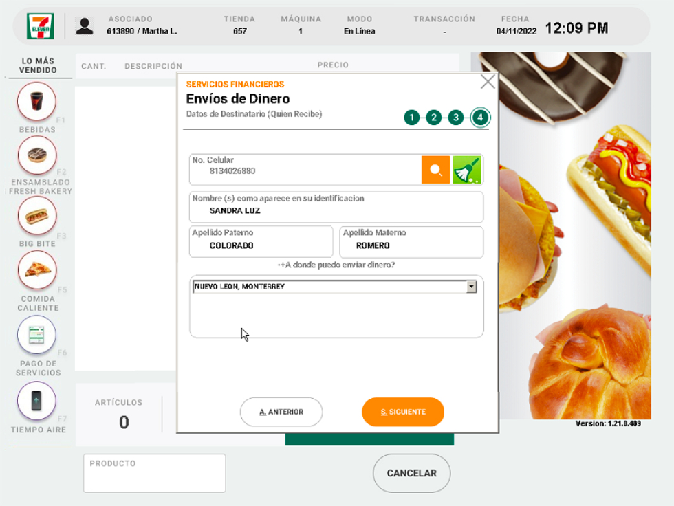 6. Solicita al cliente el numero celular del destinatario y da click en la lupa. Si ha recibido envíos anteriormente, se llenaran en automático sus datos, de lo contrario, es necesario que captures la información como aparece en la identificación con la cual realizarán el cobro del dinero.